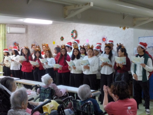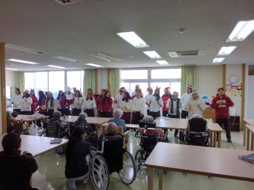 学生さんの 笑顔とパワフルな歌声 に、利用者さんも職員も自然と笑顔に。手拍子や口ずさみもあちこちから聞こえ、まるで小さなコンサートのようでした!