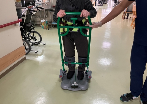 現在はリハビリの場面から使用を始めていますが、普段は車椅子で低い目線の利用者様が、無理なく立ち上がった姿勢で窓の外の景色を眺められるようになり、笑顔が見られることも増えました。ちょっとした気分転換にもつながっているようです。